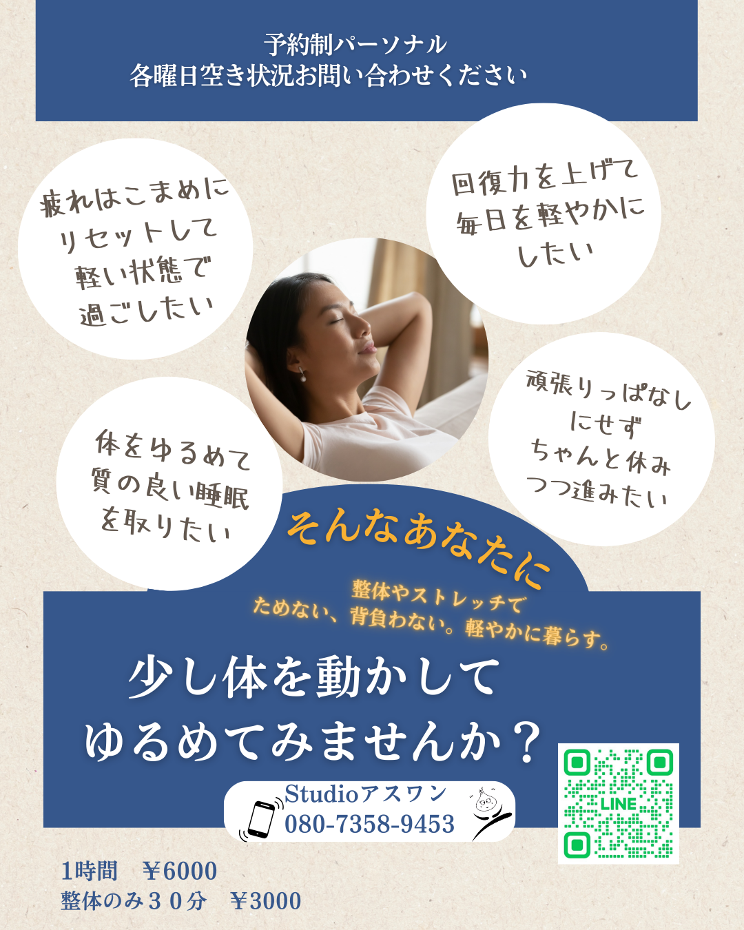 体をいたわる、整体とストレッチの時間 2026.01.08 Studioアスワンは、「がんばらせない」「無理をしない」やさしい整体とストレッチのパーソナルケアです。 疲れがたまった体に、強い刺激は必要ありません。呼吸と動きを大切にしながら、今のあなたに合ったペースで整えていきます。 体がゆるむと、心も自然と軽くなる。そんな時間を安心して過ごしていただけるよう、完全予約制で丁寧に対応しています。 疲れたとき、少し立ち止まりたいときに。どうぞ気軽にお越しください。