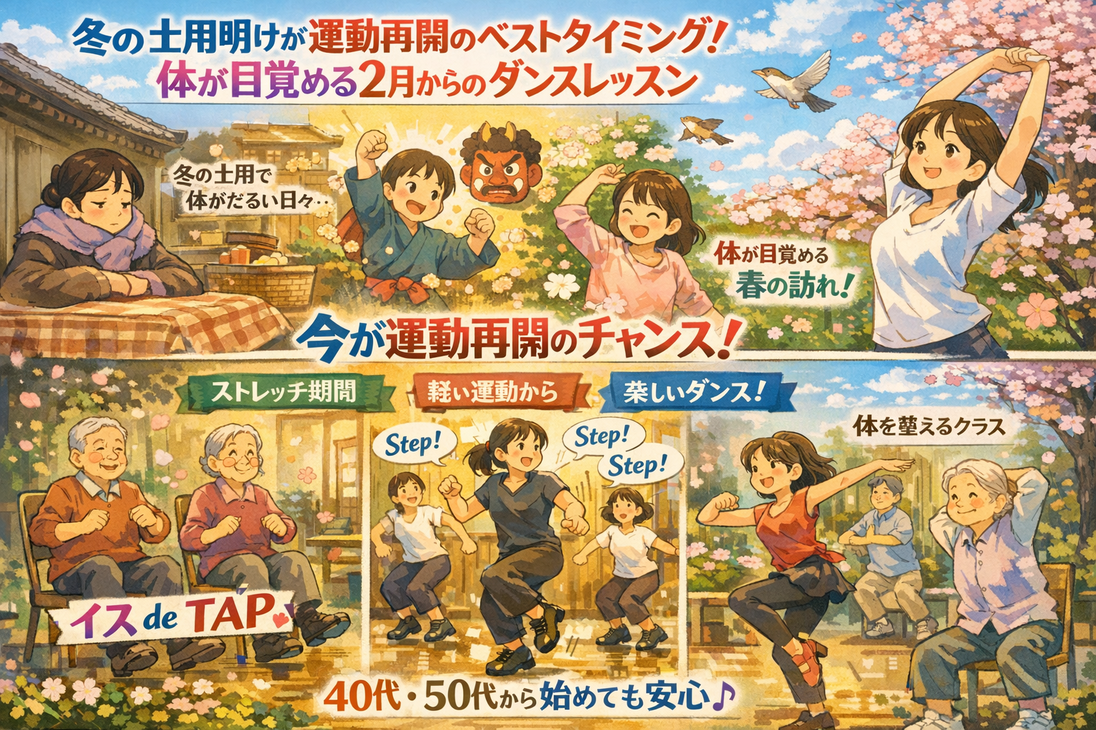 冬の土用が明けて節分を過ぎると、体は春に向けて目覚め始めます。この時期こそが運動再開のベストタイミング。東洋医学の知恵と実践的な運動再開法、そして40代50代でも無理なく始められるダンスレッスンについて詳しくご紹介します。